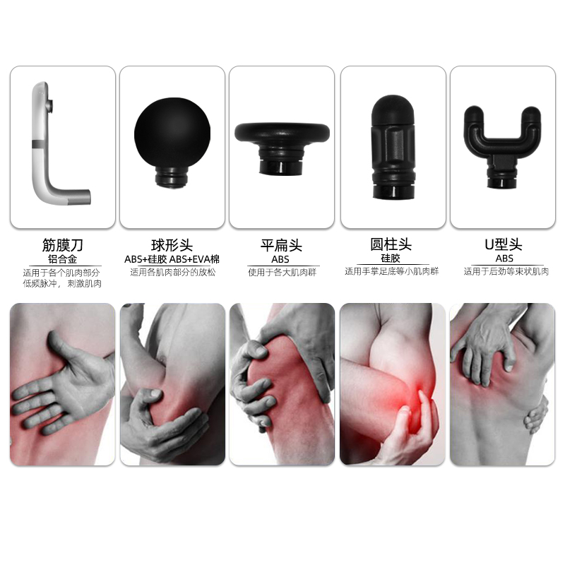 2. 標(biāo)準(zhǔn)配置:主機(jī)+筋膜刀+4種模頭+充電線+包裝