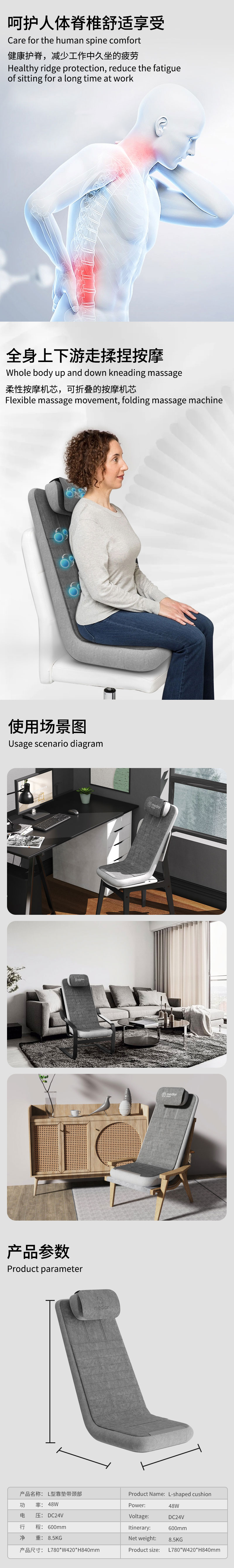 3、力度三檔調(diào)節(jié),頸部揉捏,定點(diǎn)按摩,腰背按摩、臀腿按摩、全背按摩模式選擇