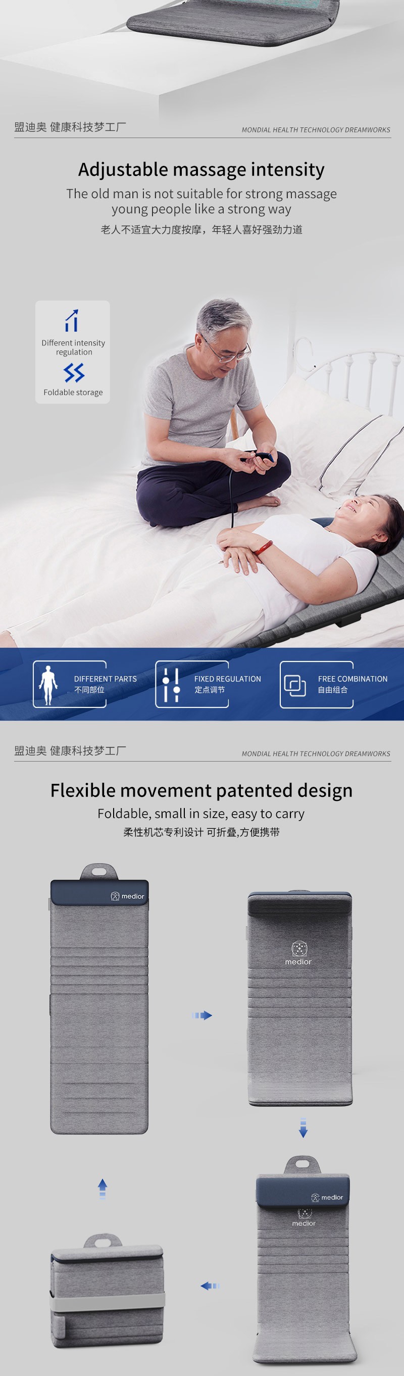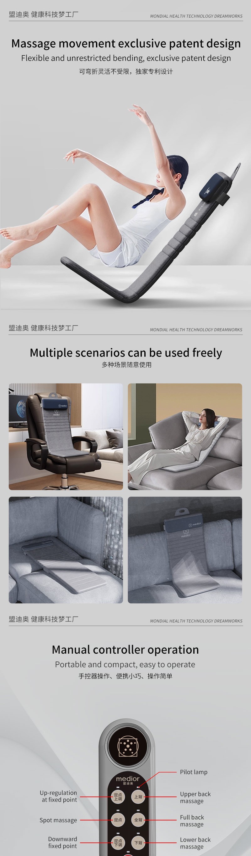3、力度三檔調(diào)節(jié),定點(diǎn)按摩,腰背按摩、臀腿按摩、全背按摩模式選擇