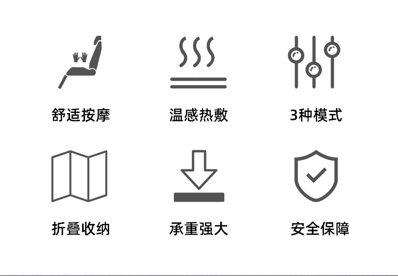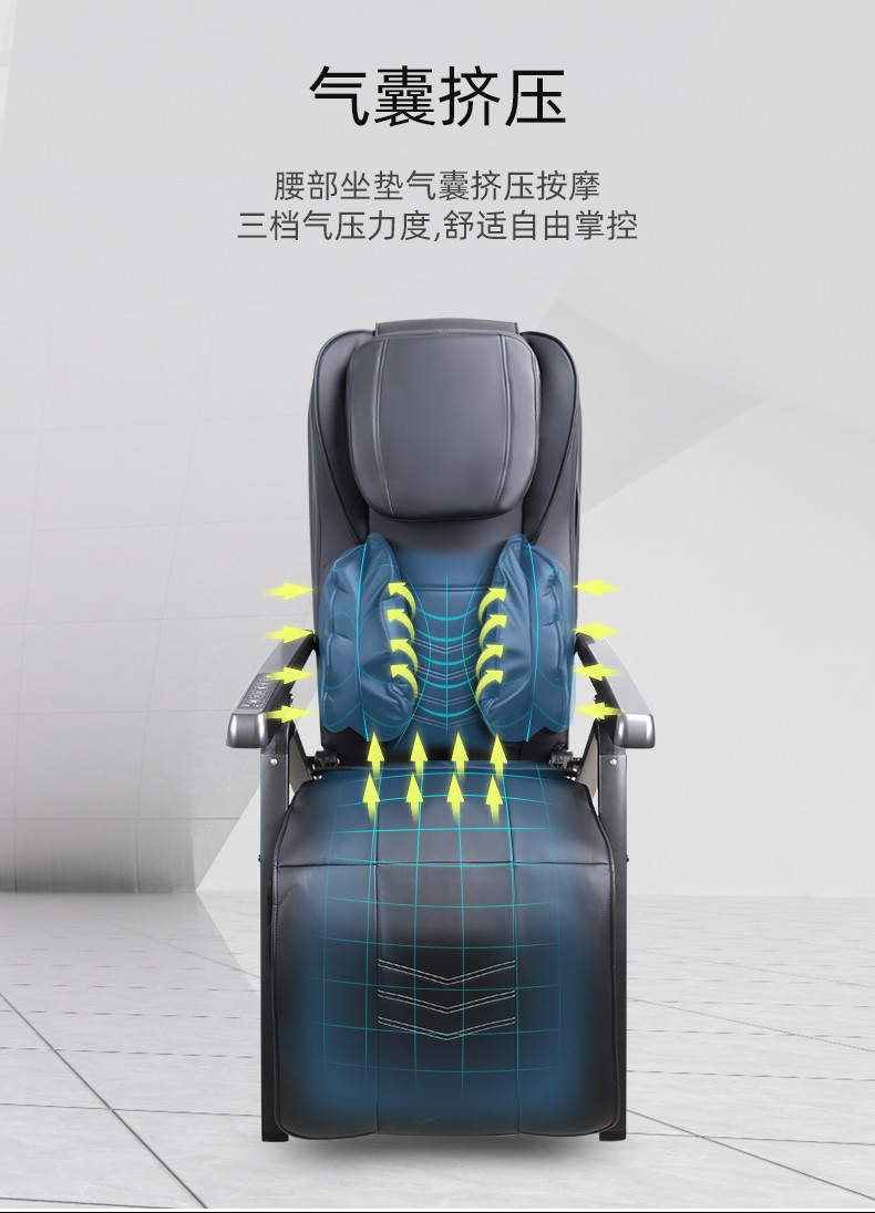 3.氣壓按摩:3檔可調:腰部雙氣袋,大氣泵,腿部雙氣袋按摩,坐墊中間兩側3D按摩