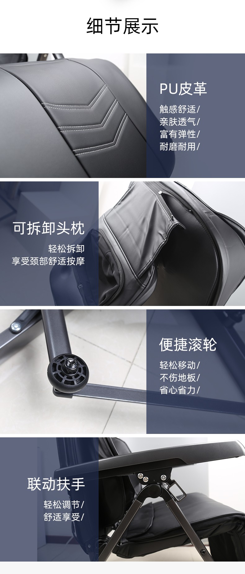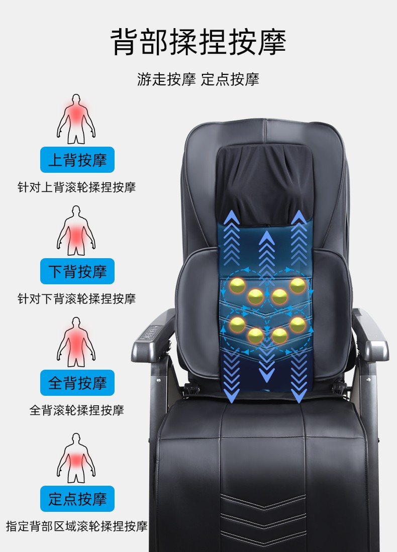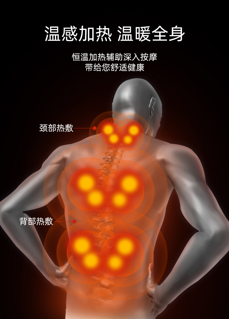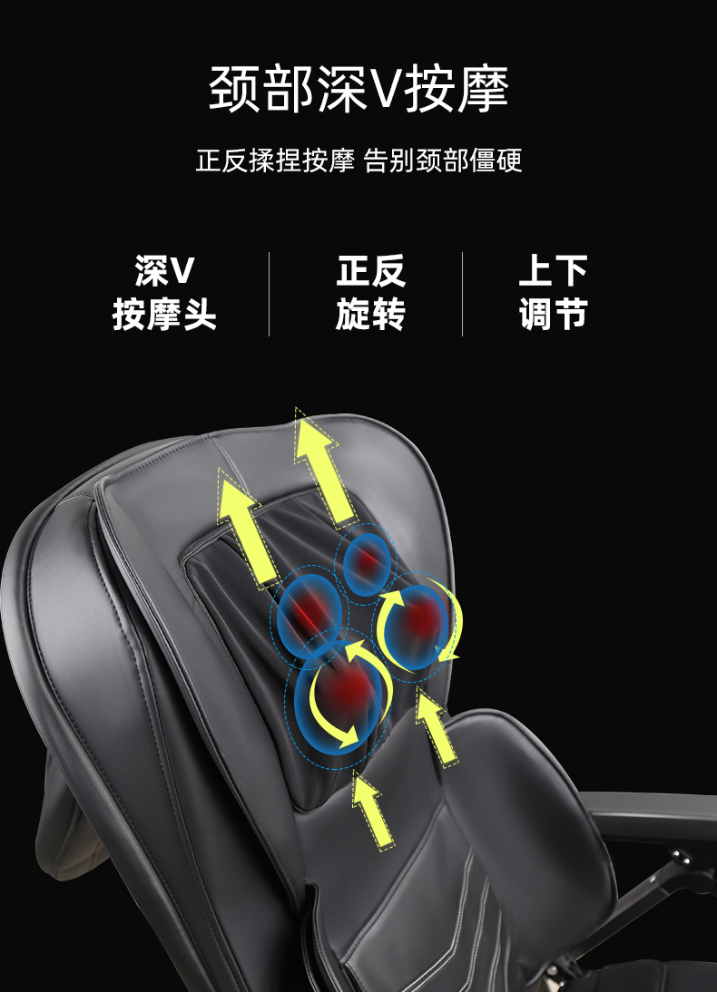 1.頸部:創(chuàng)新壓肩按摩,正反轉揉捏,上下可調節(jié)高矮適應不同人。