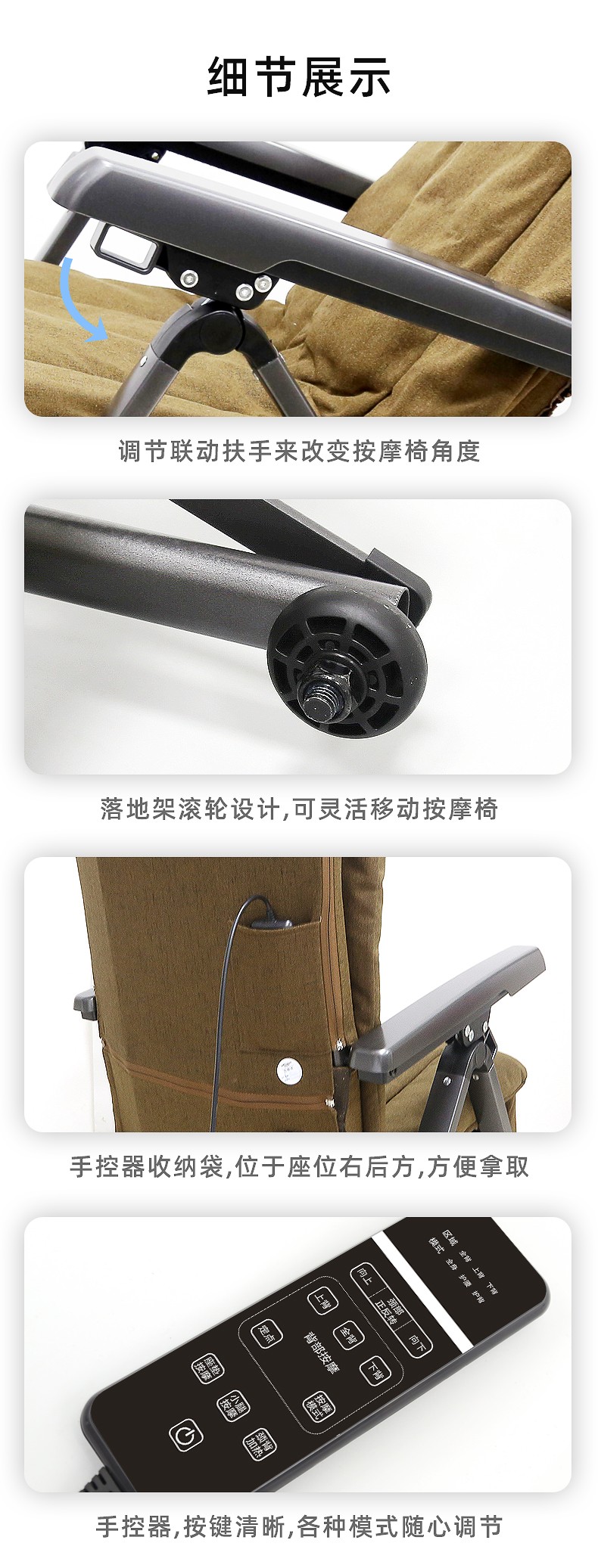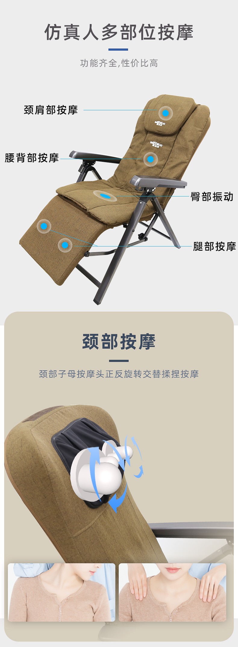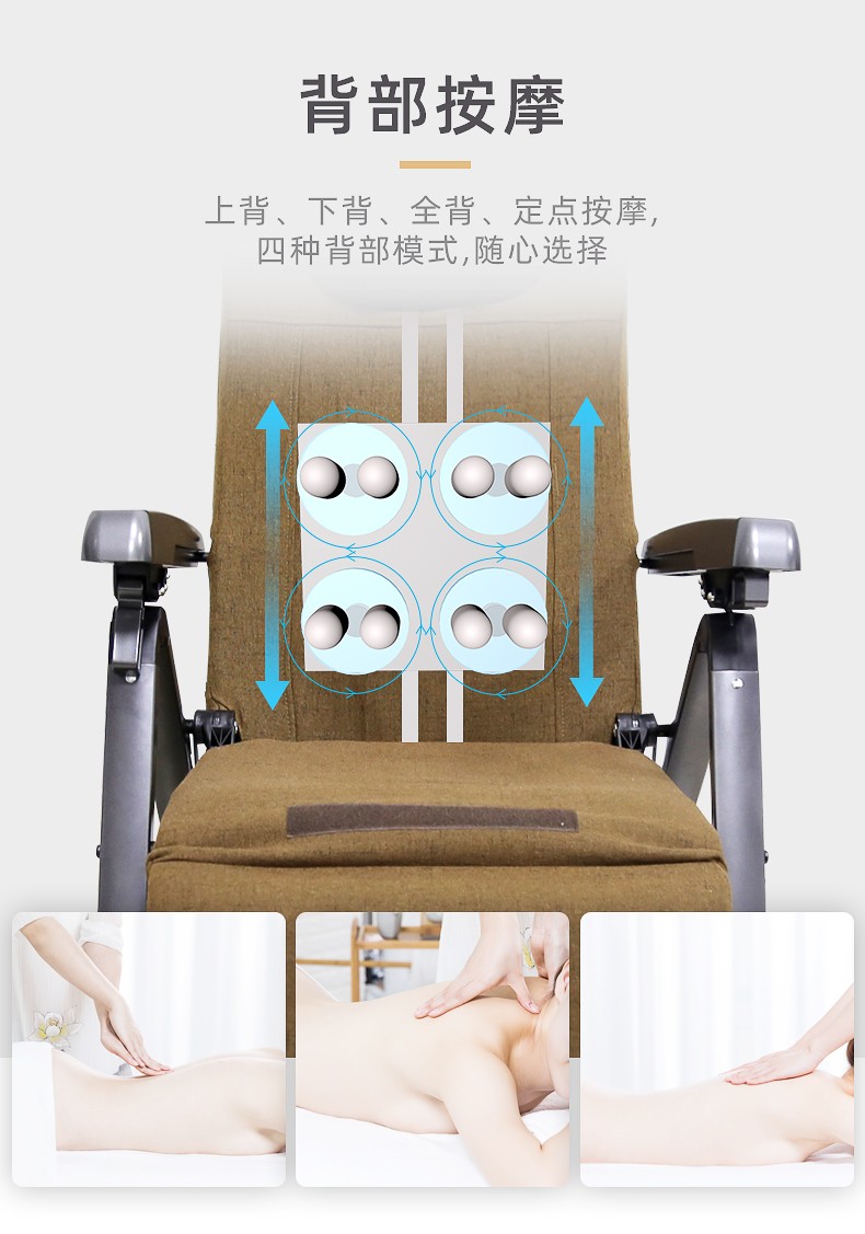 1.頸部:創(chuàng)新壓肩按摩,正反轉揉捏,上下可調節(jié)高矮適應不同人。